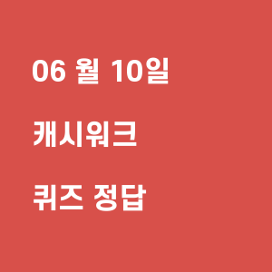 06월 10일 20시 캐시워크 퀴즈 정답 모음1+1 와이드형 자외선 차단 골프 기미 썬패치가 소비자가 21,900원 특가 OOOOO원 무료배송 14% 할인으로 진행됩니다. 빈 칸에 들어갈 숫자는 무엇일까요?정답 : 18900 100% 자연유래성분으로 혈행 개선, 붓기 개선까지 탁월한 효과가 탁월한 치유의 보라색과 소년같은 에너지의 회복력을 가진 브랜드 OOOO은 ?정답 : 보라소년 3시간 동안 진행되는 제로딜 타임특가에서 아임닭 든든한 볶음밥/주먹밥/닭가슴살/소스둠뿍 BEST 패키지가 무료배송 특가를 선보입니다. 바쁘닭 현미/찹쌀 주먹밥 8종은 무려 16개에 15900원에 진행되는데요. 상품 중 간장계란 버터 현미주먹밥은 1팩당 몇 kcal 일까요?정답 : 185 3시간 동안 진행되는 캐시딜 타임특가에서..